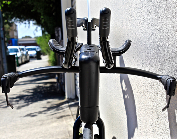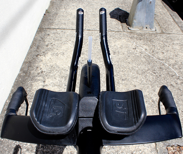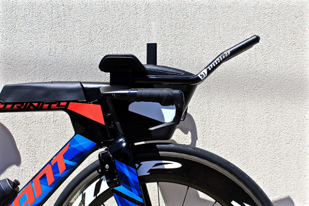 Up close with the front end of the Applelton Giant Trinity Advanced Pro 0. The extensions are by 51 Speedshop and the the Giant aero vault integrated front hydration system has a 750ml capacity. Appleton uses the bento box on the toptube to store gels.