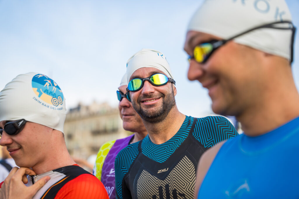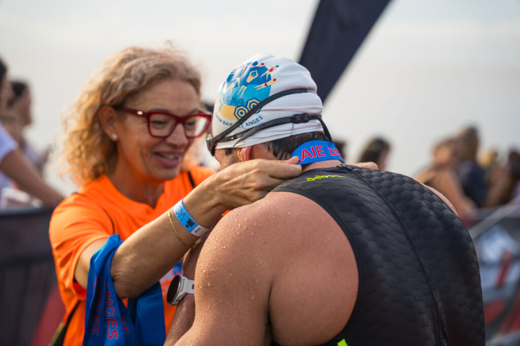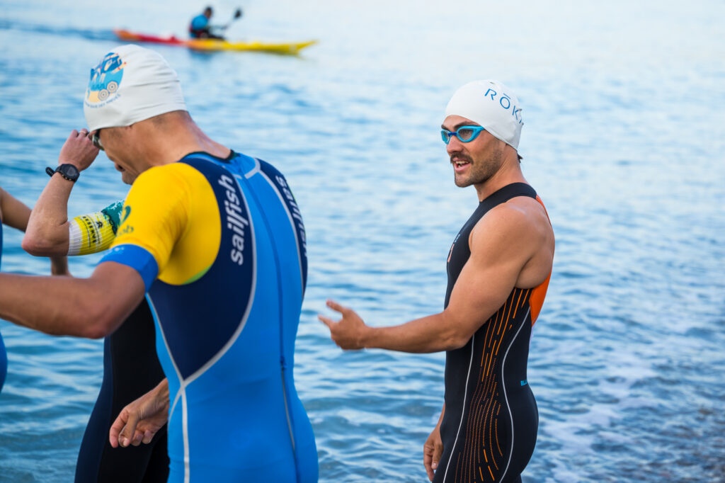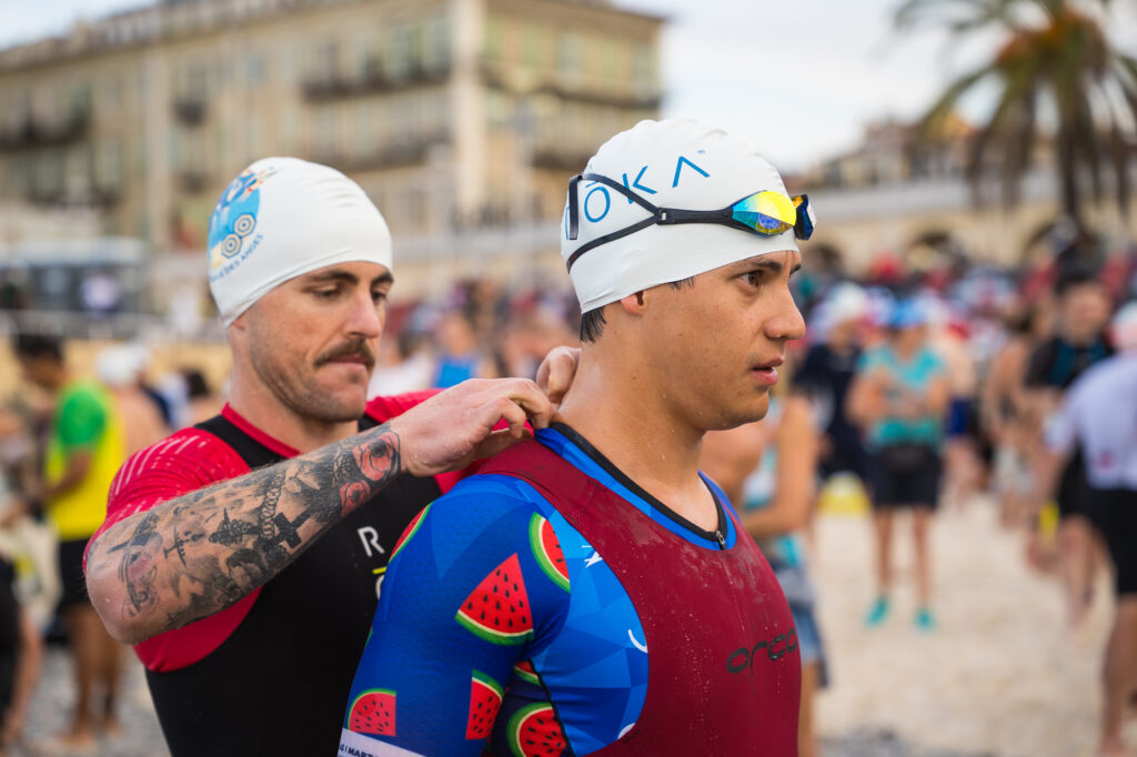 Australia’s Sam Askey-Doran (pictured above), who set a new swim course record at the IRONMAN World Championship in Kona last year (45:43), led the way out of the water at today’s Swim Baie des Anges – the practice swim for the big event on Sunday. The 481 participants completed a 1.9-km (1.2-mile) swim that roughly duplicates the first leg of Sunday’s swim.