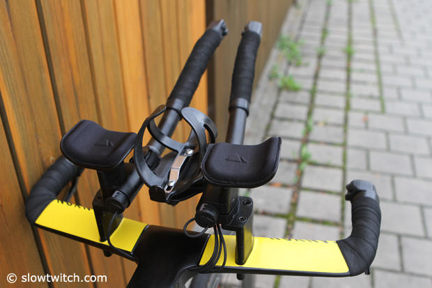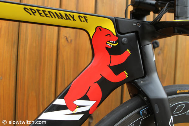 Up close with the cockpit of this Speedmax CF. Frommhold has 2 button Di2 shifters and a BTA cage setup.