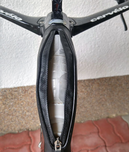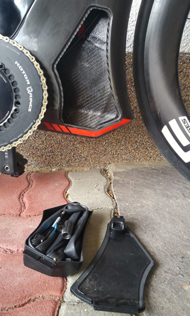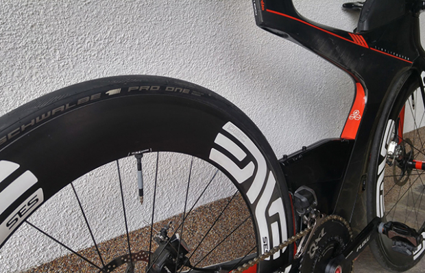 25mm Schwalbe Pro One Tubeless tires on ENVE 7.8 disc brake rims. During training sessions Wurtele mount a bottle cage on top of the speed case, and in cold races such as Challenge Iceland he carries a spare vest inside that case.