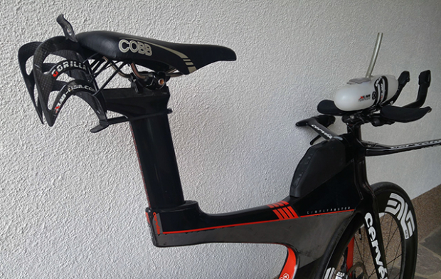 Wurtele zip tied the XLab Gorilla cage behind the Cobb SHC saddle to get it in the position he desired. The XLab BTA bottle is mounted backwards to allow space for a computer mount,