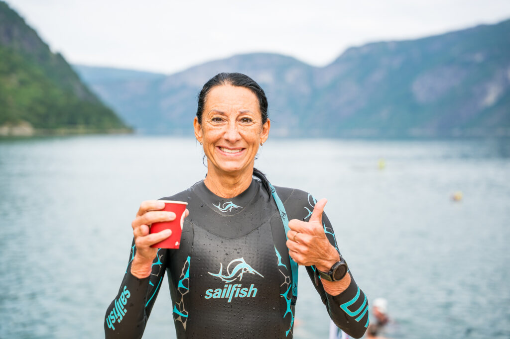 Canada’s France Lemieux, 59, is in Eidfjord to race the Norseman for the first time, and she says it is a dream come true to be here. “I’ve waited to do this race for seven years,” she says. She has raced CanadaMan/ Woman (the XTRI World Tour event in her home province of Quebec) three times, and she says she is ready to finally conquer the Norseman.