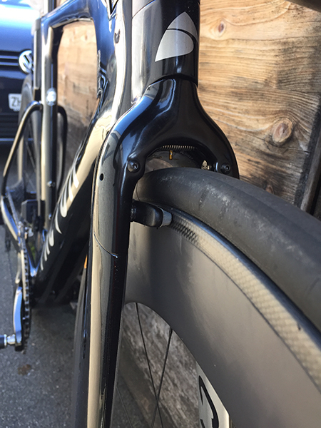 The front brake is hidden in the fork and here is a look up close with the Black Inc front 800.