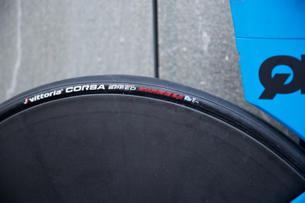 The front tire on that HED Vanquish 8 is a 25mm Vittoria Corsa Speed TLR that measures 27.5mm and Hovda runs Silca latex tubes, because he has been unable to set up the tires tubeless.