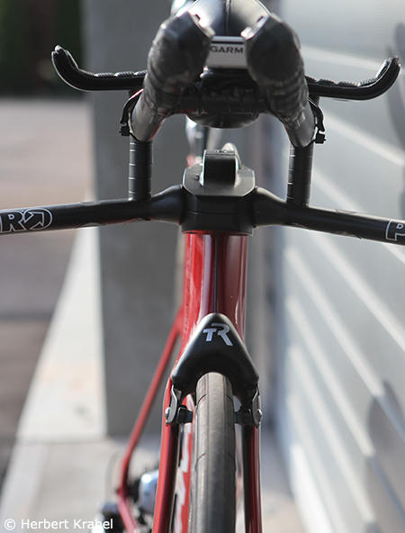 Lasse Ibert is 1.78 meters tall and weighs 72kg (compared to the fat 86kg author) and he rides this 52cm QR PRsix in a very cool Dodge red paint and a Zipp 808 Firecrest wheel up front and a Lightweight Autobahn Disc in the rear.
