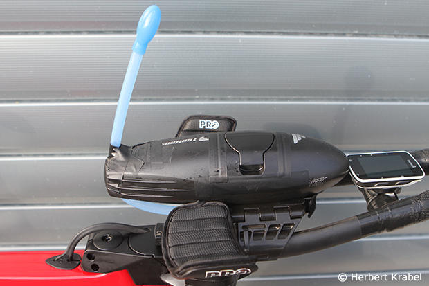 The Garmin 520 computer is mounted to this Pro Evo Missile bars with a custom bridge. Notice also the 3M anti slip tape.