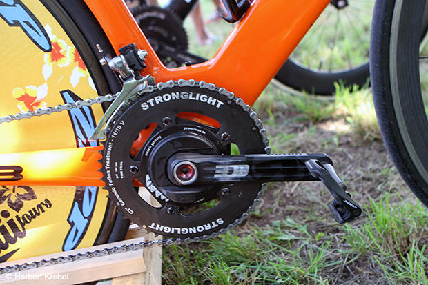 Rotor 3D cranks with a Power2Max power meter and a Stronglight ceramic teflon coated outer.