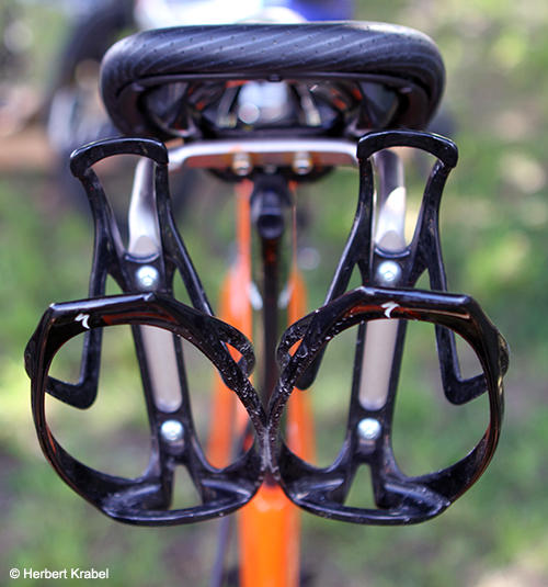 Two Specialized cages are attached to an old school and simple holder.