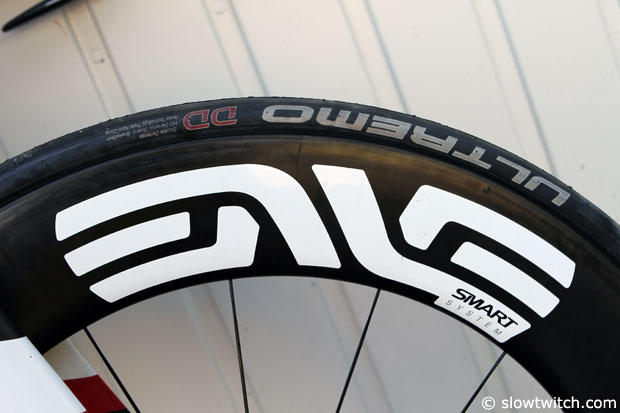 Enve SES wheels are connected with Schwalbe Ultremo DD tires.