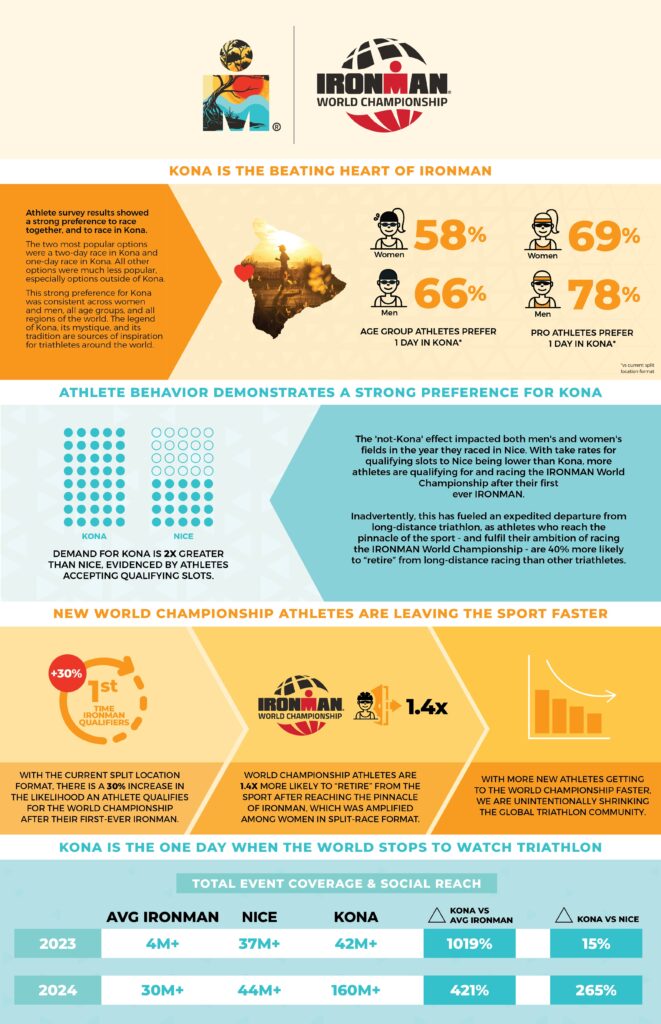 Today’s announcement that the IRONMAN World Championship would return to a one-day event in Kailua-Kona, Hawaii is the result of extensive research and surveys. You can check out the infographic IRONMAN provided with that information below. Here are some of the main takeaways: