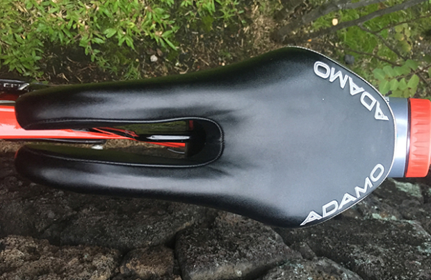 An XLab Gorilla cage is mounted below his ISM Adamo Podium saddle. A spare tube and tools are likely in that storage box behind, and hopefully won't be needed.