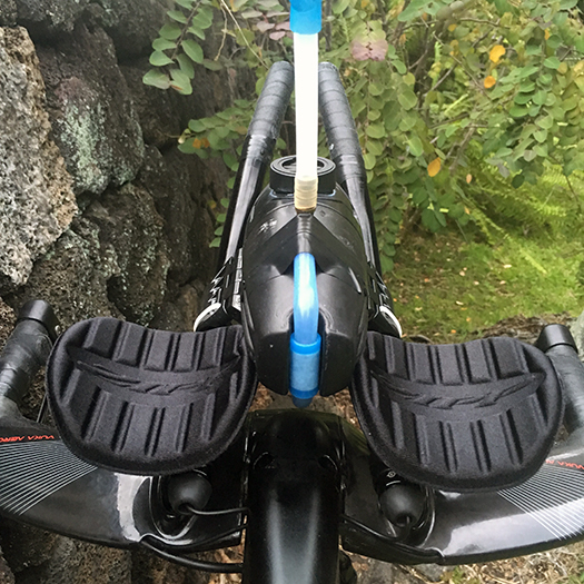 Up close with the Zipp Vuka Aero cockpit and the Zipp Vuka Alumina Evo 110 extensions. A TorHans AeroZ bottle is mounted on top of the extensions.