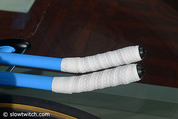One of the highlights of the currently ongoing Handmade Bike Show in Denver, CO is the clean stunning white and blue TT steel offering by Rob English of English Cycles. This bike is actually the personal TT bike of the man whose name adorns it in a very understated way, and it has a 76 degree seat angle and a 72 degree.