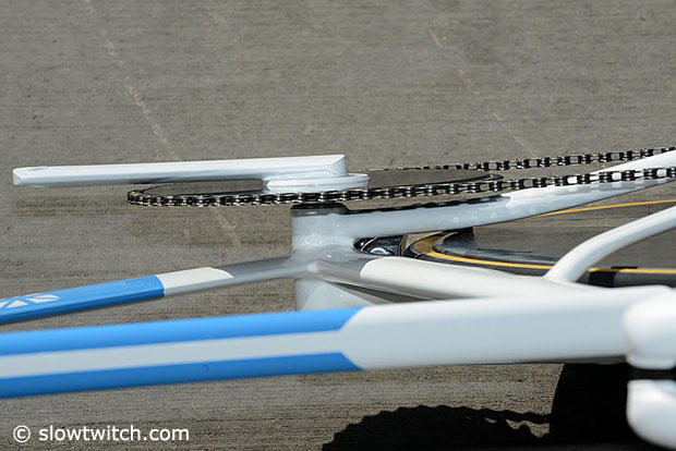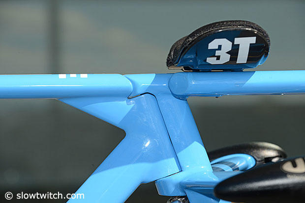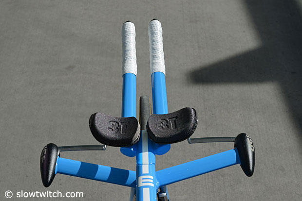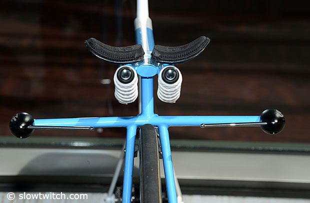 The view from the front shows the narrow profile of the bike and the custom Shimano Di2 buttons.