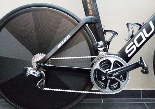 Van Cleven rides 175 cm cranks with a Quarq power meter. Chainrings are 55-42 and the cassette 11-28 as he is getting ready for a big climbing race in Mallorca. Derailleurs are SRAM Red Etap.
