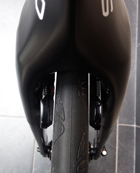 The front TRP brake on the fork is hidden behind a cover. Van Cleven uses Zipp brake pads to stop the Zipp 808 up front and the Zipp clincher disc in the back.