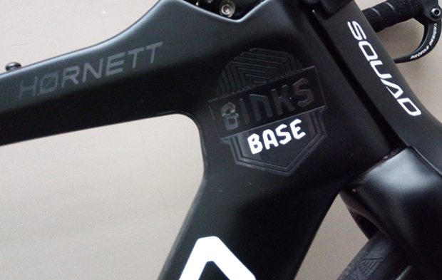 Van Cleven describes the paint scheme as follows: "Bink's Base – Uruz sign is incorporated in this logo. Uruz meaning = life force, physical health, courage, formation, healing, vigor and endurance. In the frame you can see the Uruz bull and Bink's Base logo." Bink is the nickname of Marino Vanhoenacker – his mentor, and Bink's Base is a crossfit brand in Belgium.