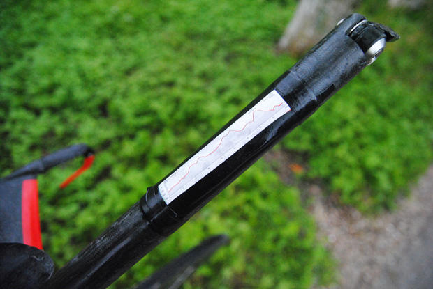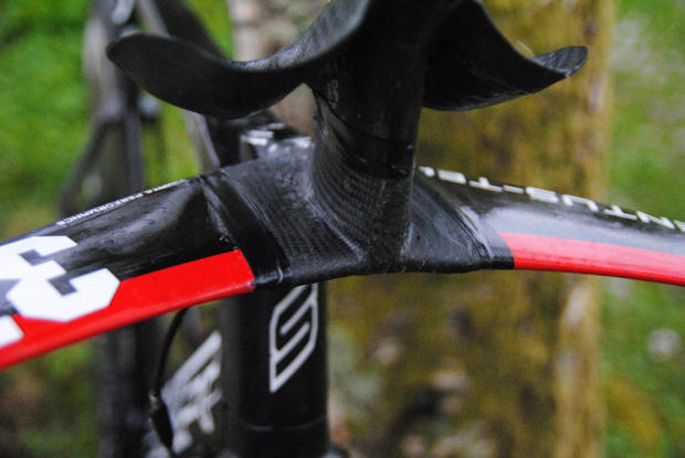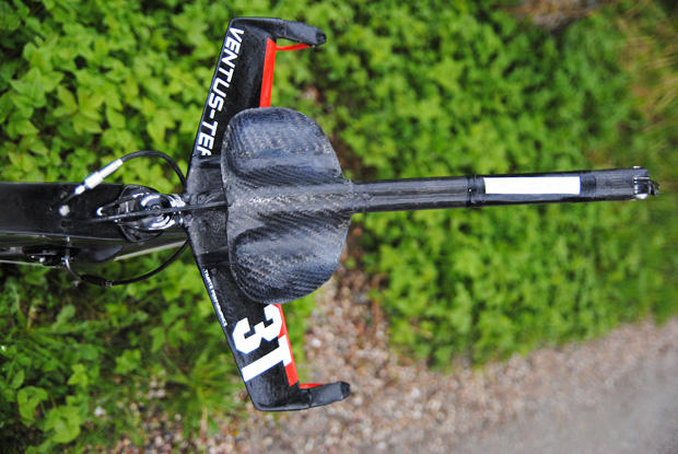 The customized extension for these 3T Ventus bars are truly unique. Snilstveit said this setup is lighter and stiffer and the singular SRAM shifter is mounted direct without the expansion wedge. Length of the extension is 40.5cm.