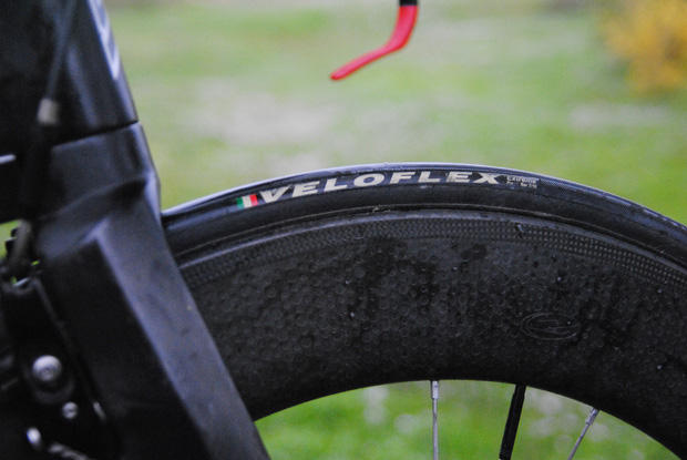A Veloflex tubular 22mm tire is mounted up front on a Zipp 808 Firecrest. In the back the setup is Veloflex 25mm tubular on a Zipp Sub9 disc.