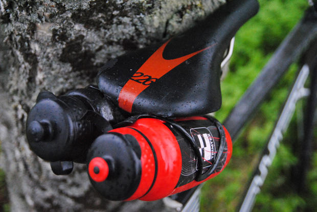 The Norwegian rides an Essax 226 saddle with 2 Arundel Mandible zip tied close below. He drilled 2 holes under the saddle for the zip ties. Usually he uses 1 bottle for gel and 1 for liquids.