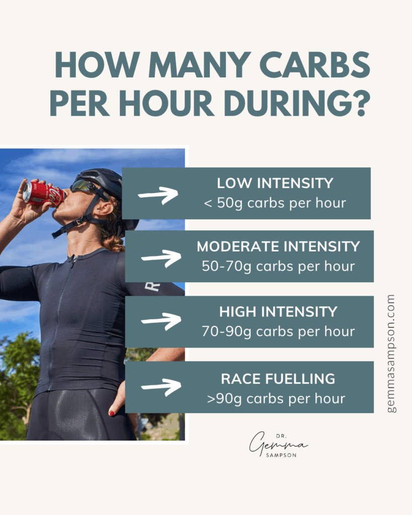 “Anything less than 50 g of carbs per hour I would classify as low intensity training, which is really only useful in recovery training,” she puts simply. “As the intensity increases and the need for performance increases, so should the amount of carbs you are using.”