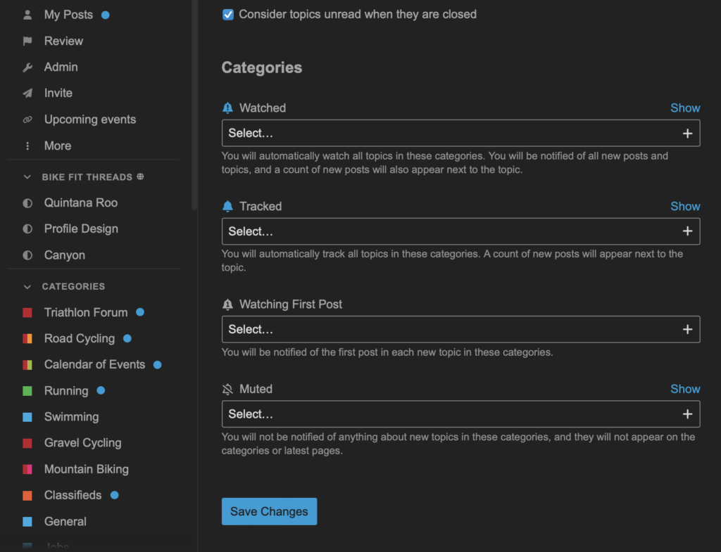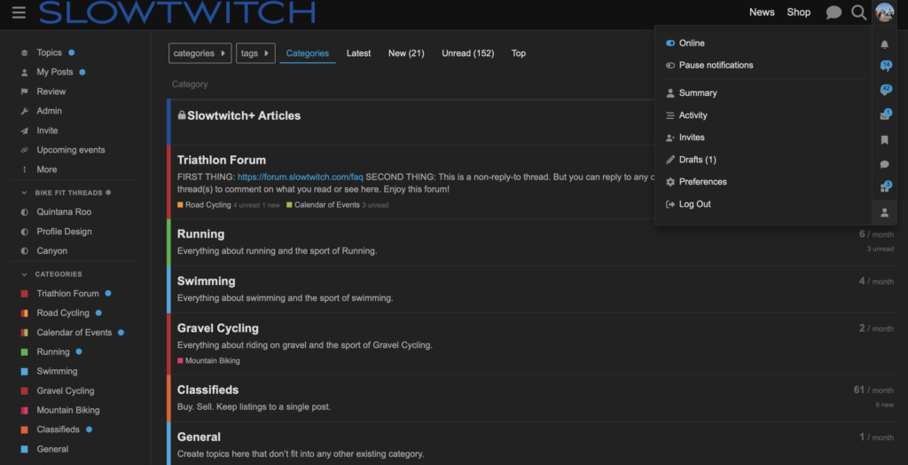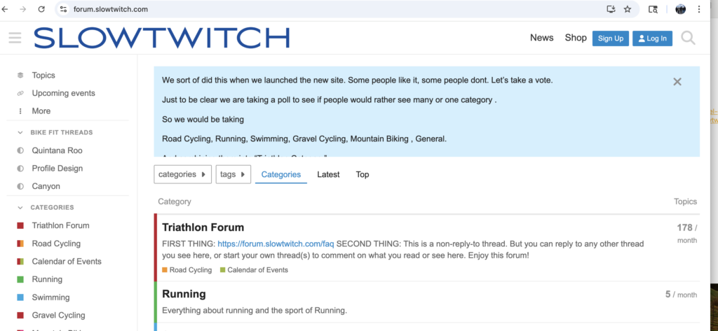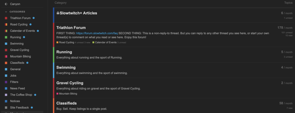 The beauty of our architecture for the Slowtwitch Forums is that it is customizable to how you would like to see content. Our default view is to organize content by our various categories, which include: