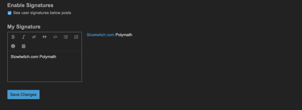 To turn a signature on, which will appear below every one of your posts, you’ll click on Profile, scroll to the bottom, and check the box to enable signatures.