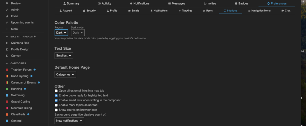 Want to go into Dark Mode? Or use some other color palette beyond the default white? Click on Interface, then choose your preferred color set. (The black above is Dark Mode.) This is also where you can choose to modify your default home page, or enable other settings while typing replies.