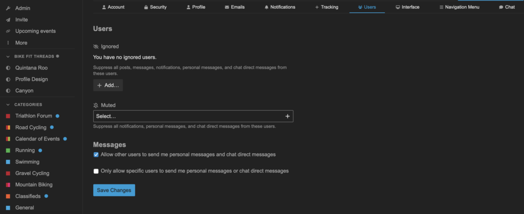 To manage this setting, click on Users, then add or select user accounts to add to either the Ignore or Mute lists. Click Save Changes when you are done.